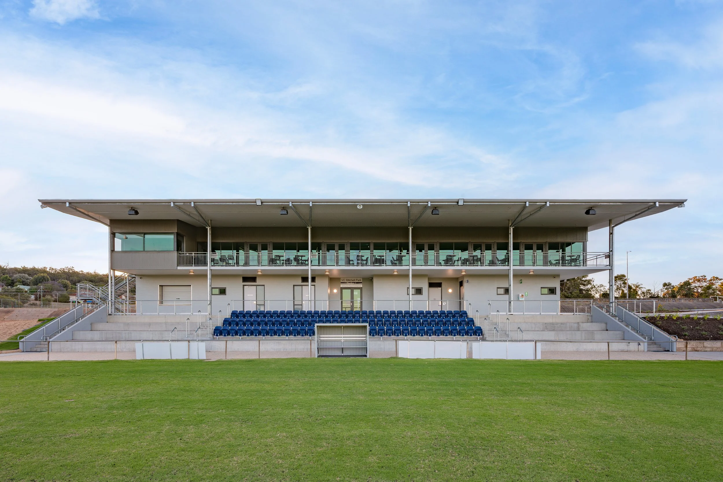New multi-purpose pavilion with change rooms, warm-up room, public toilets, umpire change facilities, service areas, GMO store and canteen.